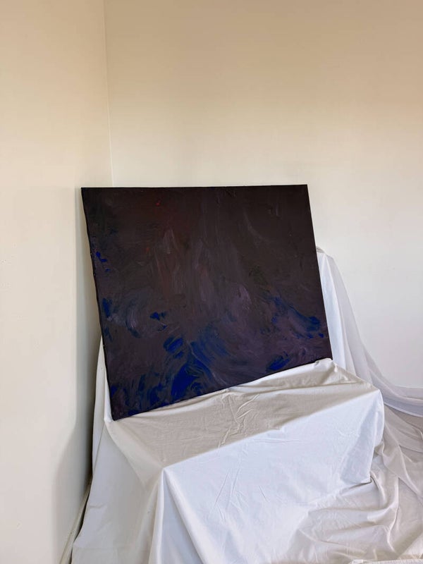Dans un pourpre naissant d'un noir profond, un bleu s'installe paisiblement. Sans pinceau, sans couteau, juste les traces de ma peau, dictée par le geste de mes emotions.